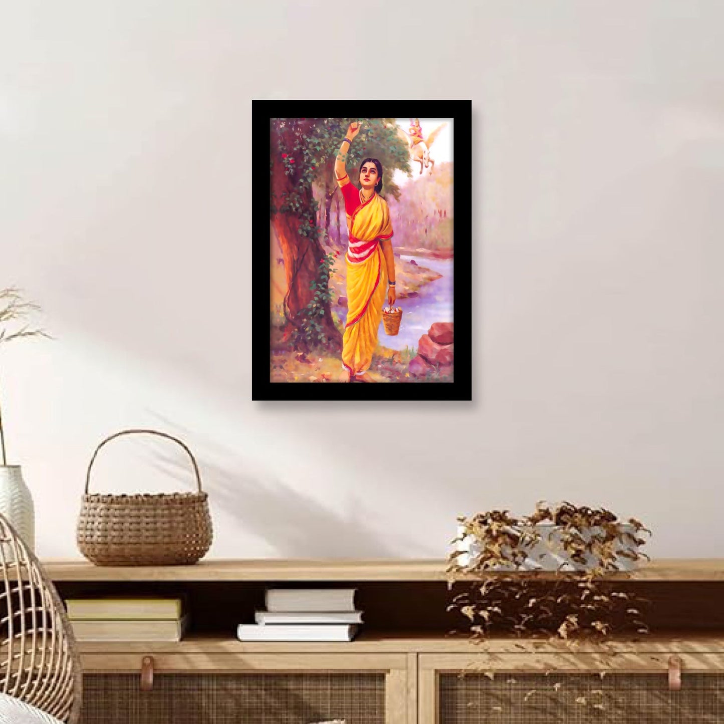 This captivating painting by Raja Ravi Varma portrays Ahalya, the symbol of beauty and redemption, with intricate detail and vibrant colors. Varma beautifully captures her grace, making this timeless masterpiece a true work of art.