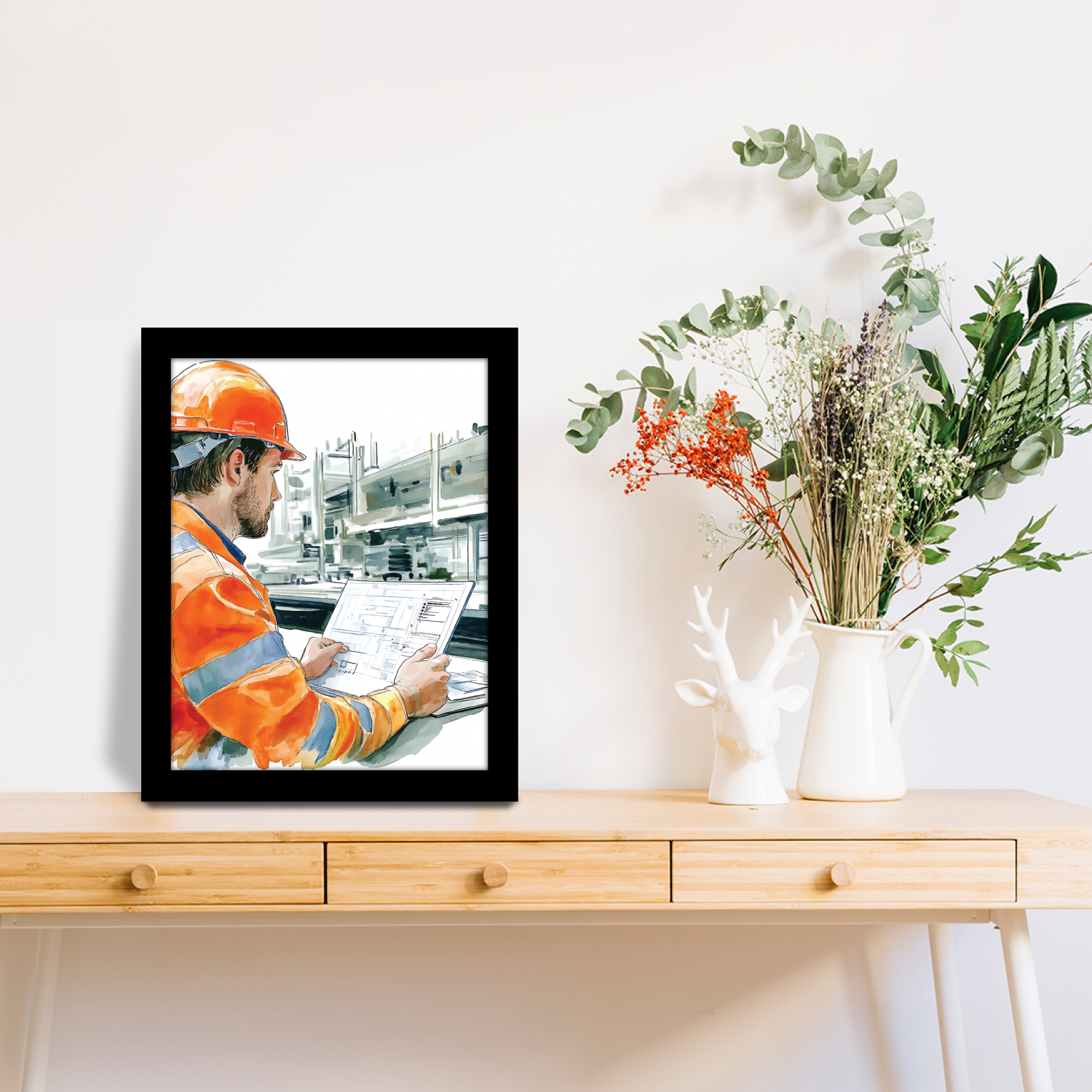 This frame captures the blend of technology and construction, showcasing a worker using a laptop to review plans on-site. A perfect décor piece for professionals who appreciate innovation, precision, and modern construction practices.