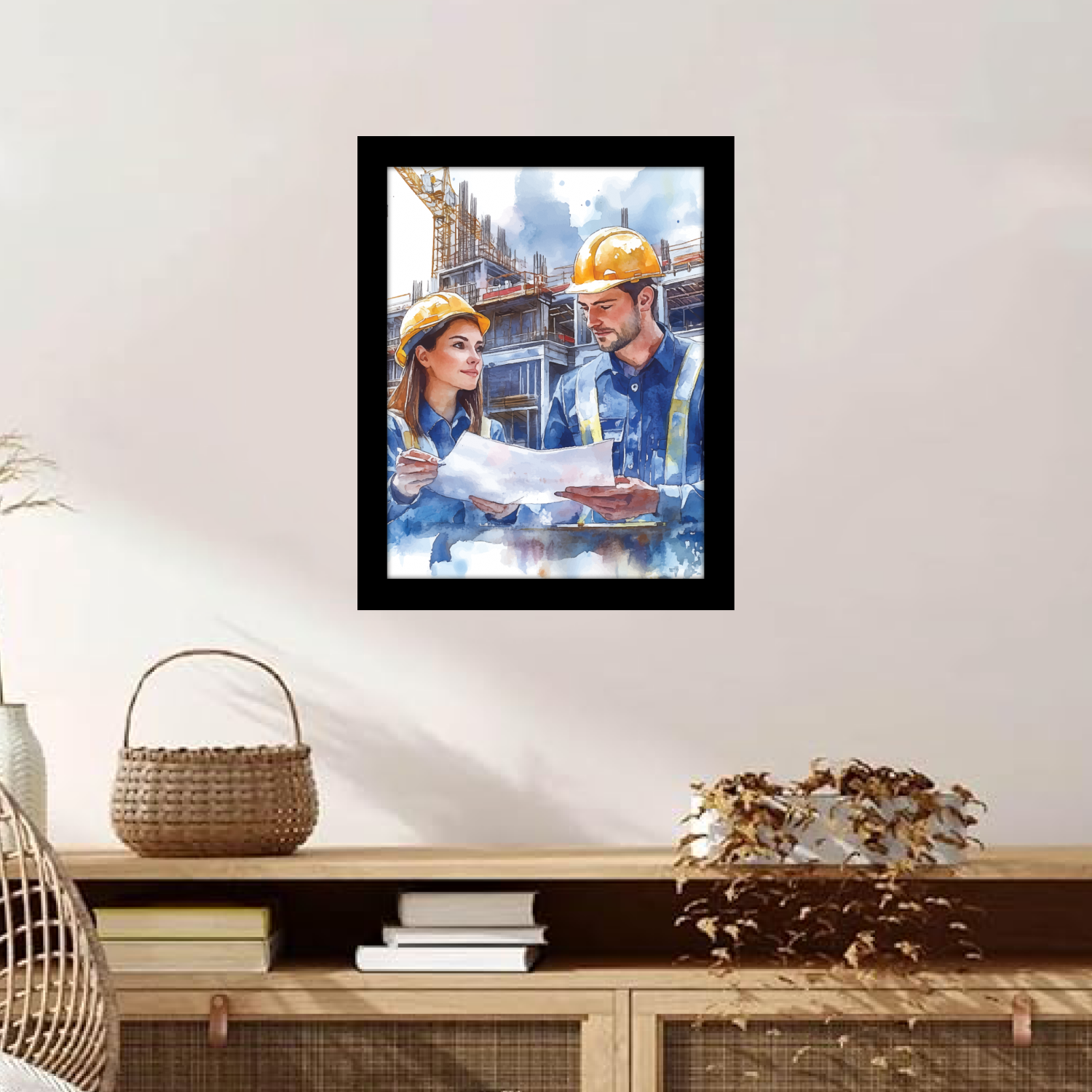Showcasing teamwork and expertise, this captivating frame features male and female engineers in deep discussion at a construction site. A perfect décor piece for offices, workspaces, and professionals who appreciate collaboration, strategic planning, and innovation in construction.